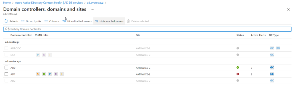 Every element is clickable to drill down one or two levels. We can see which Domain Controllers are monitored, their status, and what roles on which DC are available. As you can see below, 2 out of 5 domain controllers are installed, and monitoring is available for them.