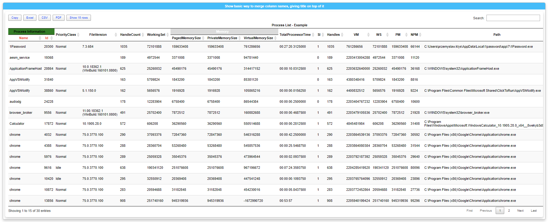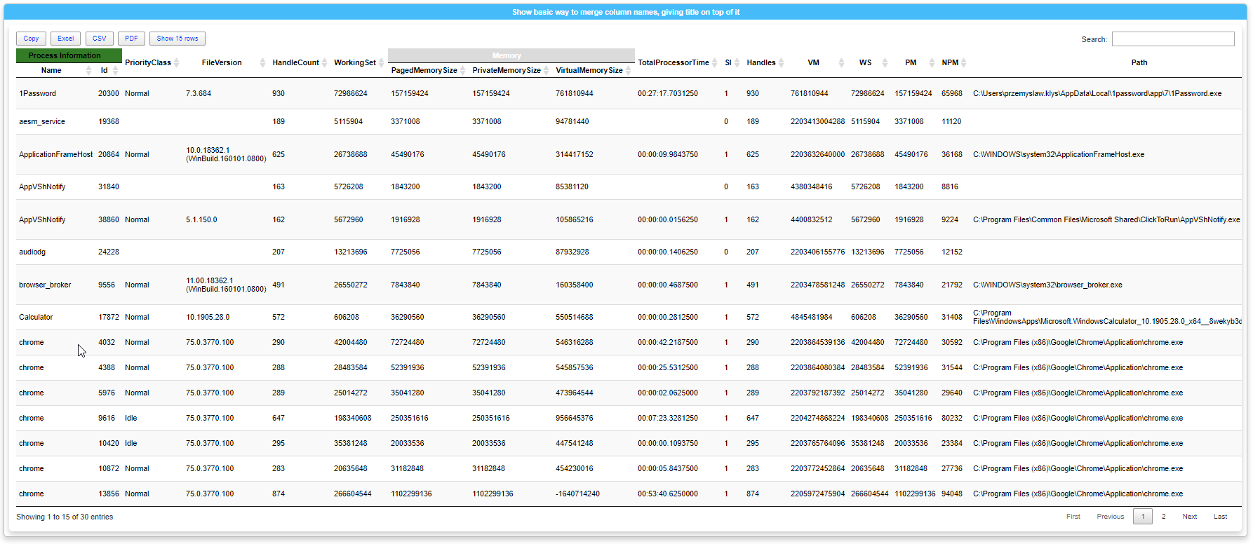 Now that you have seen all those features in action, let's go back to the beginning and make it visible what we're doing. Below is a simple table generated from Get-Process. You should notice I'm using DisableResponsiveTable switch because it has 60 columns and that makes it break excellent output, as I mentioned in the introduction. We then open bracket and use TableHeader command. In it's basic functionality, it has two parameters Names and Title. You tell Dashimo that you want to find Table Headings Name and ID and you want those two headings merged as Process Information. We do the same thing with three other headings telling it to find related memory columns and joined them together under Memory Title. Easy right?