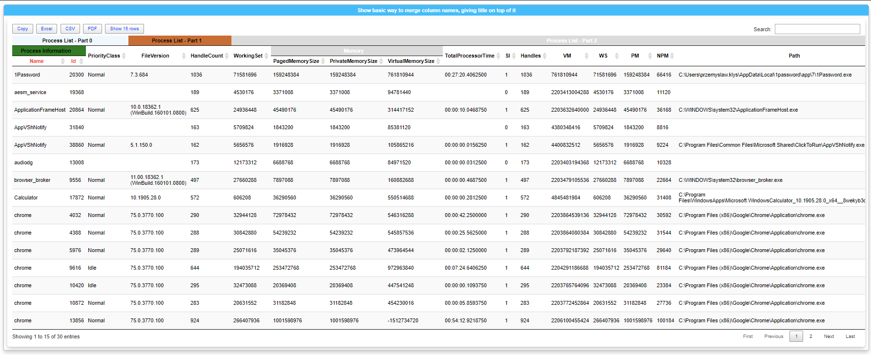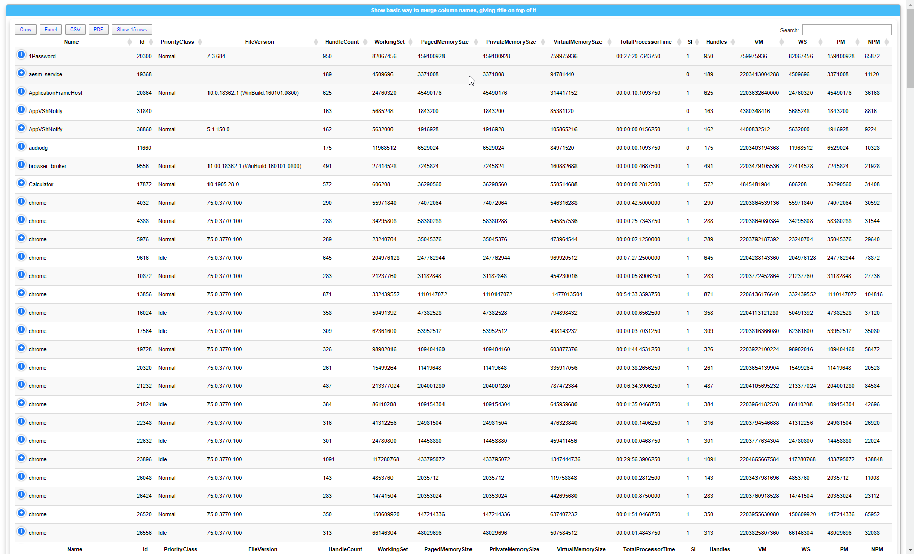 Table -DataTable $ProcessesAll -FixedHeader -FixedFooter -DisablePaging