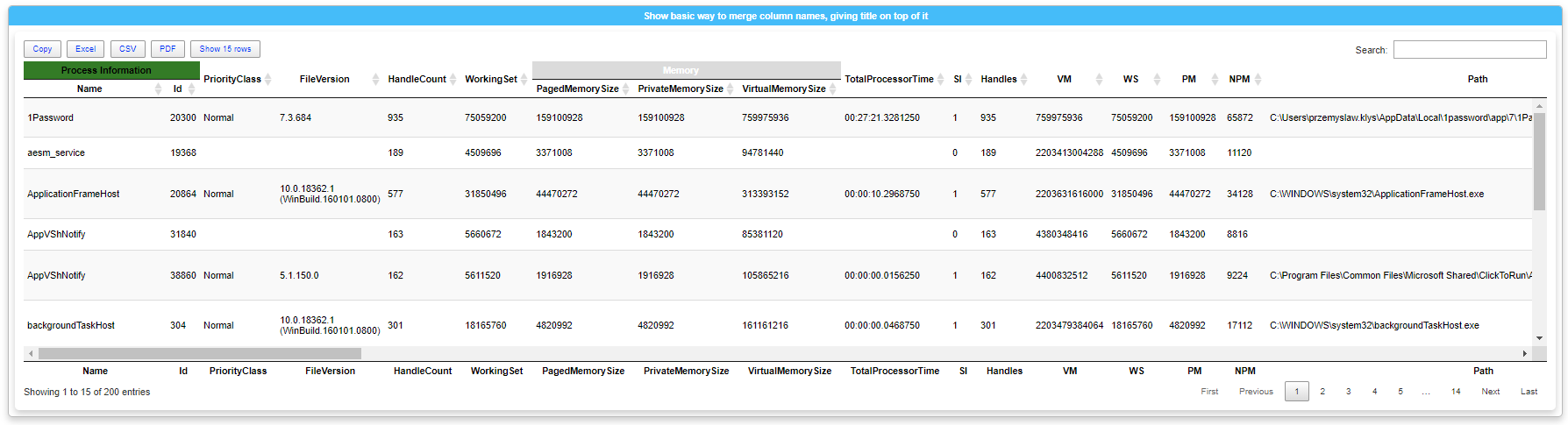 Looks cool right? Multi-row header, multiple colors to style things, and zero HTML code. Keep in mind I've not spent time on design of how colors match each other so while the above example looks ugly, you can style it as you want. This is a quick and dirty way to show you a new feature of command New-HTMLTableHeader. What's also important here is New-HTMLTableCondition command. The difference between those two is that New-HTMLTableHeader modifies HTML during the PowerShell Table building process. So it reads the header and manipulates all that is required to achieve results you see above. For New-HTMLTableCondition, it's a different story. It makes comparison during displaying of HTML with JavaScript. Why this matters? Well, it matters because table condition most likely has almost 0 impacts on the** table generation time** and it won't be visible if you disable JavaScript. On the other hand, the header does manipulation during generation so you may see some performance impact. Not something you will notice, but still worth to know.