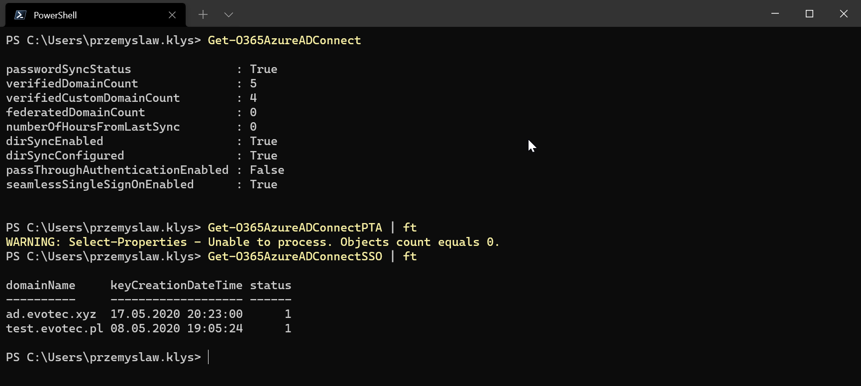 This means that auditing Office 365 Tenants can be much easier with those new commands. While it shows above that there is an error when processing PTA agents, it does work properly for the tenant that has it set up.