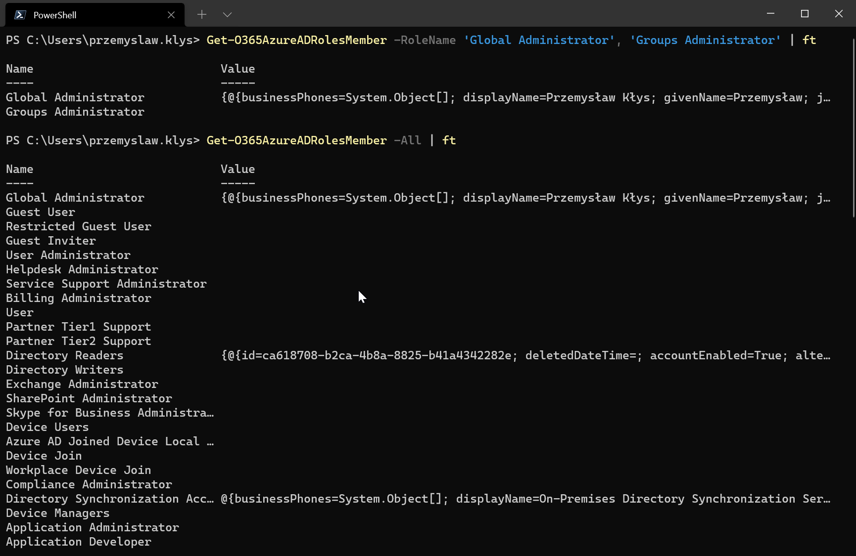 While this module at the beginning of its existence focuses on things you're not able to do using official PowerShell modules, I will add more and more commands that use supported Graph API calls to manage Office 365. That's why I'm going to write some commands to behave more human-friendly, starting with Azure AD Roles Members. You can now ask for specific roles or all roles and get everything back with just one query. No need to convert ID roles to names, no need to query Office 365 multiple times. One query – done.