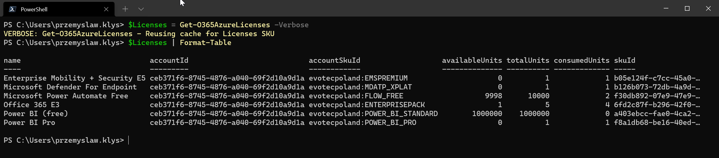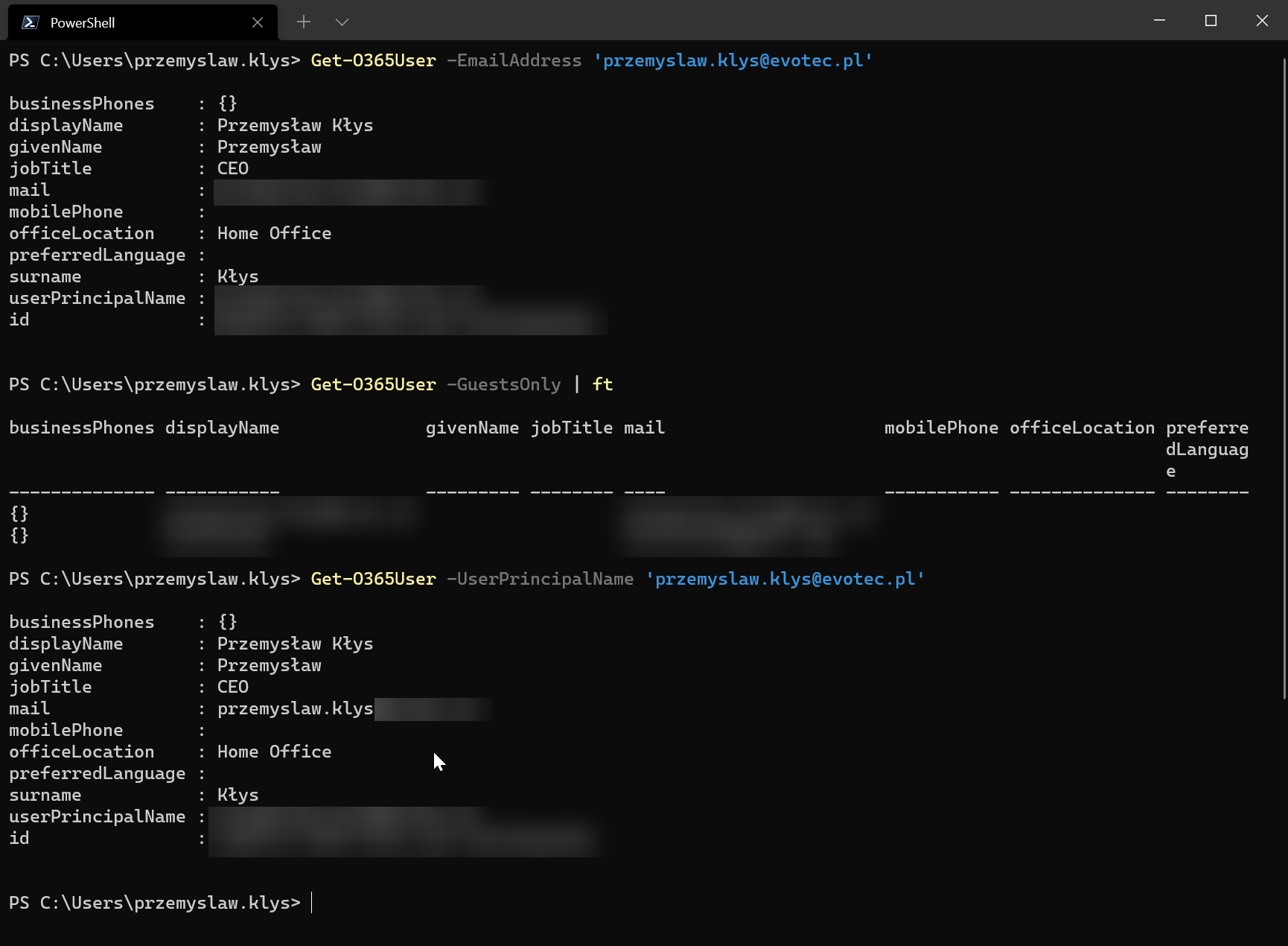 Get-O365User -UserPrincipalName 'przemyslaw.klys@domain.pl'