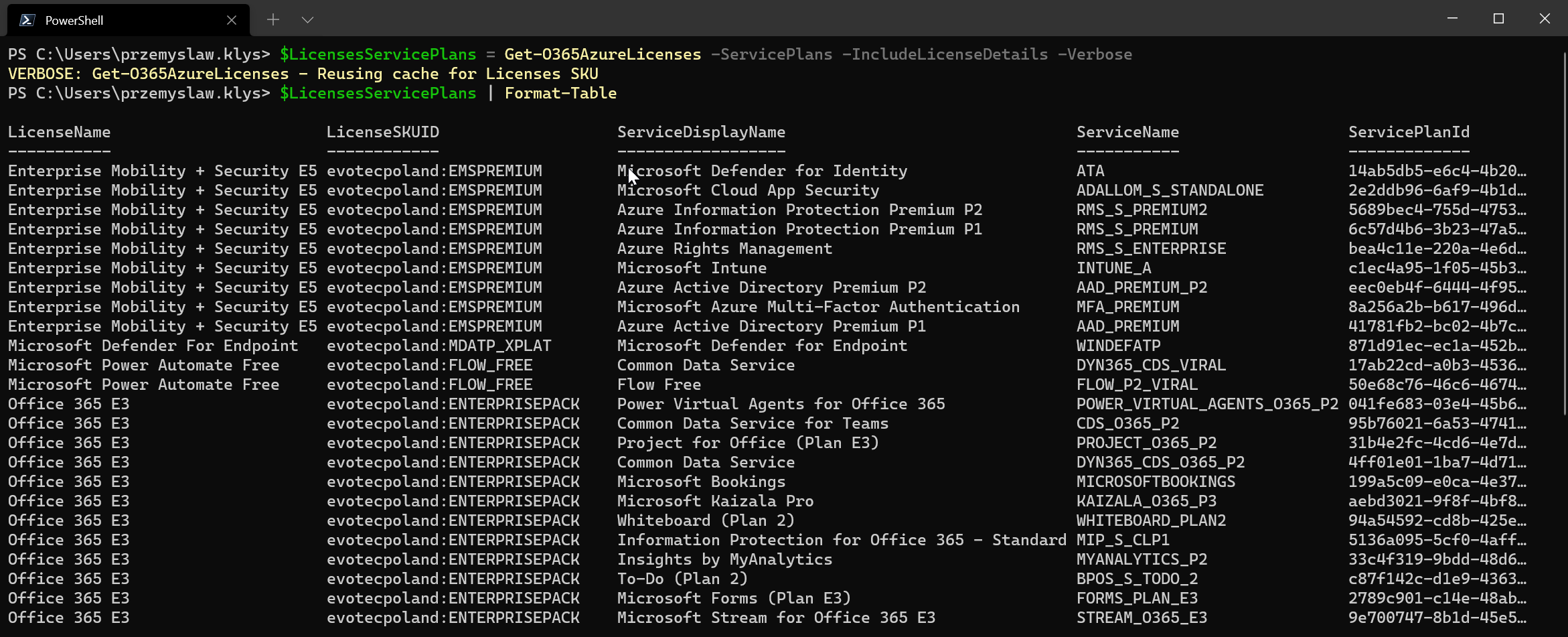 But that's not all. What I don't like about Microsoft's way of displaying data to users in their official modules or Graph API calls is that they return ID in many cases. ID for everything, and it's up to you to find out what that ID means. This is something that, for most people, in the beginning, is very hard to understand and do their own logic for that. For years, dealing with Office 365 licenses, you had to provide SKUID or ServiceName rather than what you see in the Office 365 portal. I understand there may be a reason for this, but it makes it a real pain for normal users. What does ADALLOM_S_STANDALONE mean? What is DYN365_CDS_VIRAL for? That's why if possible, for most commands that output data or even set some data, I try to allow the ability to use either ID, GroupName, Name, or DisplayName. One of those commands that may be useful for day-to-day is extracting license names and service plans for them with a full display name.