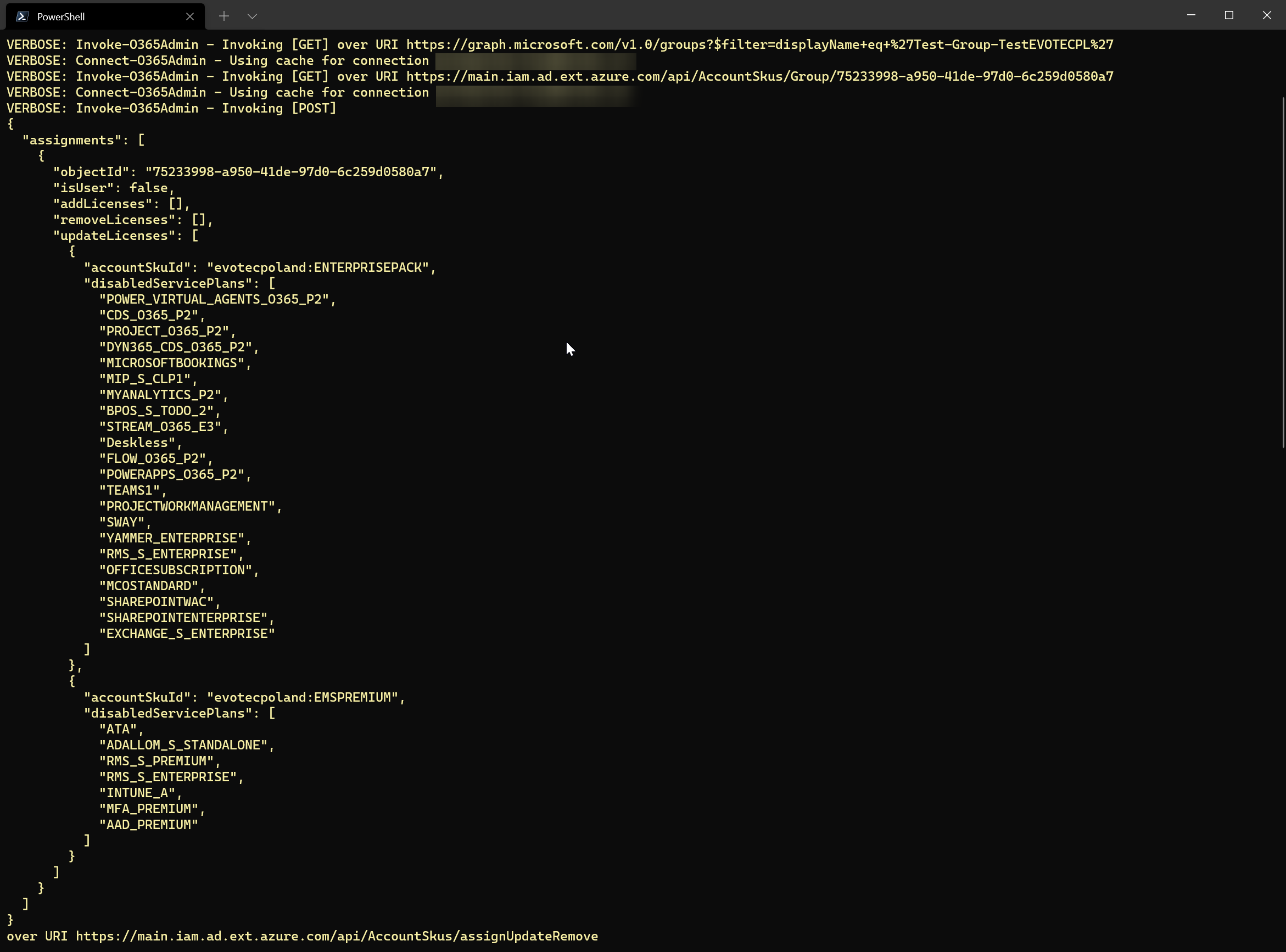 I've added the commands above for licensing for a simple reason – to make it more user-friendly when using other commands. Let's take this another example of using Group-Based Licensing. You can do it from the GUI, of course, but it's not so easy when using PowerShell. Using GroupID, LicenseSKUID, and Disabled Service Name (instead of what makes more sense – Enabled).