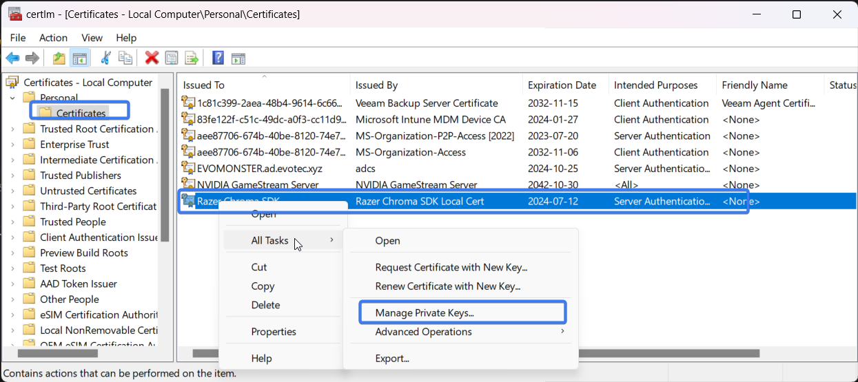 Of course, you need to do it on your proper certificate, not the Razer Chroma SDK certificate, as shown in the screenshot.