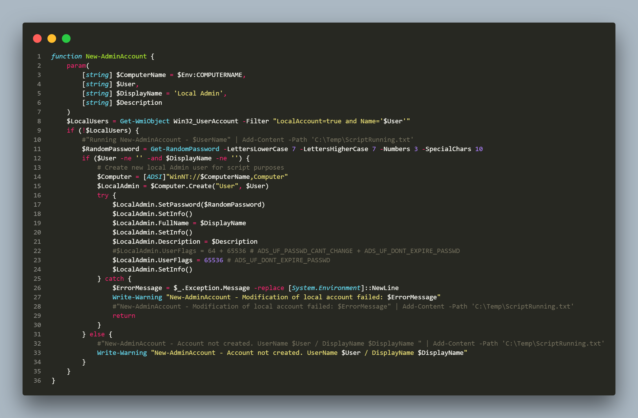 New-AdminAccount -User 'LocalAdmin' -DisplayName 'Local Administrator'