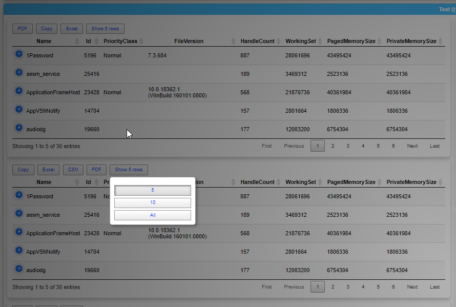 Table -DataTable $Process -Buttons copyHtml5, excelHtml5, pdfHtml5 -DisableSearch -DisablePaging