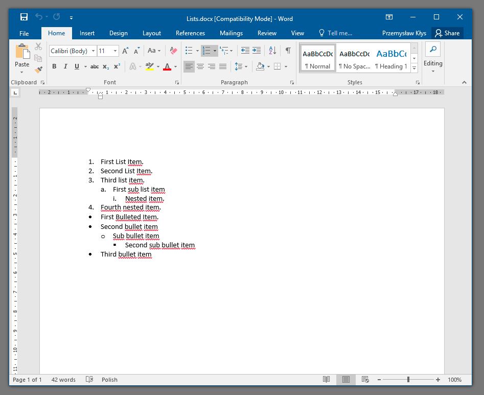 Code above should create an output file called Lists.docx. If you start it up the view should be showing nice Nested Lists.