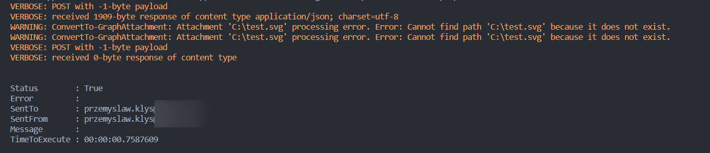 Send-EmailMessage -From 'przemyslaw.klys@test.pl' -To 'przemyslaw.klys@test.pl' -Credential $Credential -HTML $Body -Subject 'This is another test email' -Graph -Verbose -Priority Low -Attachment "C:\test.svg" -ReplyTo "kontakt@test.pl" -RequestReadReceipt -RequestDeliveryReceipt