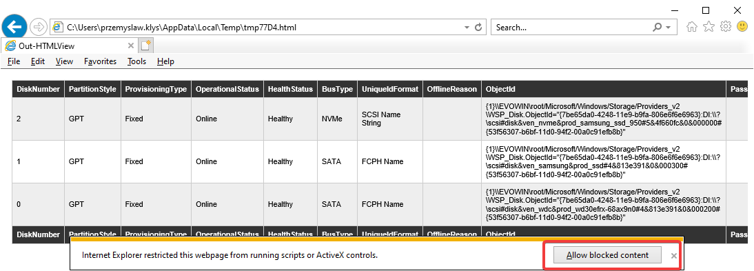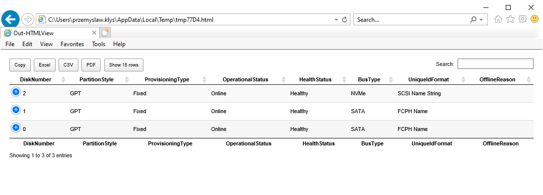 Get-Disk | Out-HtmlView