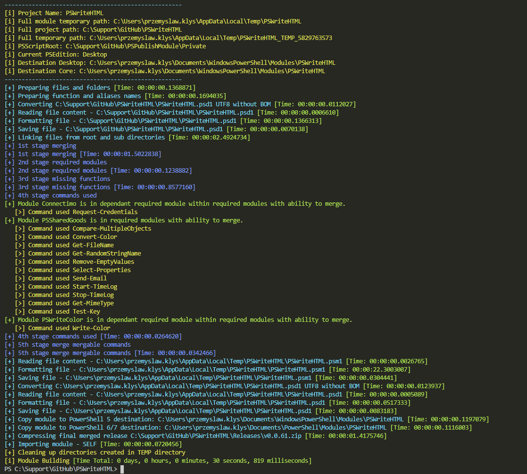 I've now expanded the module, so it detects functions that were used inside the PowerShell module (in this case PSWriteHTML) and if there are any external dependencies, it decides whether it can merge those. As you can see above PSWriteHTML which used to bundle PSSharedGoods that additional bundled PSWriteColor and Connectimo for just 2 functions is no more. But it only works like that during release. The development version still uses dependencies as it used to. As long as you don't intend to give back any code to the project, it shouldn't matter for you. It's not super fast, but it should make few people happy.