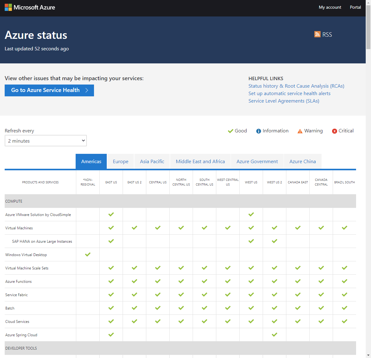 Some time ago I've wrote PowerShell way to get all information about Office 365 Service Health, and if you were thinking that I would try the same concept for Azure Services you were right. However, I failed. This is because Office 365 Health can be gathered using Microsoft Graph API, and Azure Health information, as far as I know, is not available in the form I wanted it. Azure Status is available as part of Azure Status website. Contrary to Office 365 health you don't have to login to your Office 365 tenant to read it.