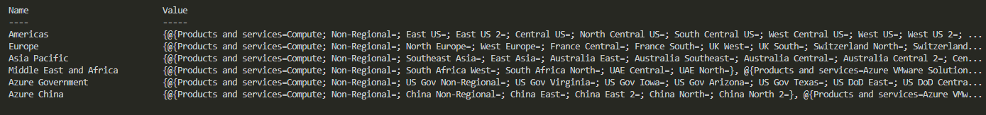 ConvertFrom-HTMLTable parses whole HTML and returns an Array of **Tables (**actually Arrays). This means we can access each table separatly. In case of Azure, there are five tables on that website and we can access them using index from 0 to 4.
