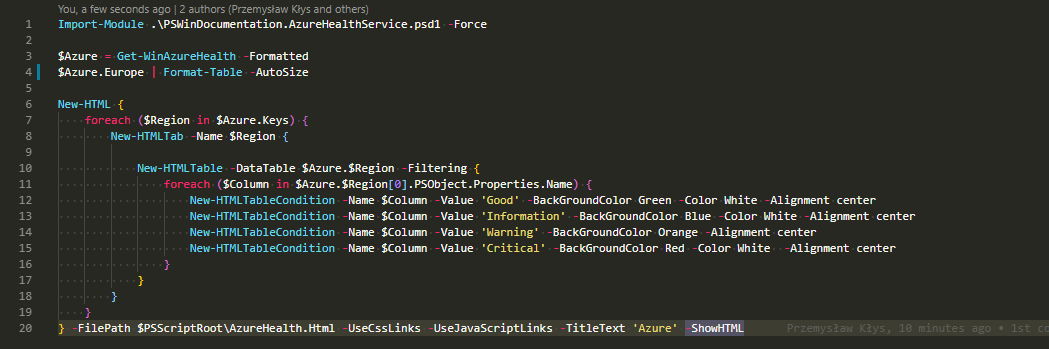 Since PSWriteHTMLis my most loved PowerShell module – the output is somewhat impressive (if you ask me!) for the 20 lines of code. You can see the generated version of Azure Health Service Dashboard – or enjoy the screenshot. It shows what you need to see.