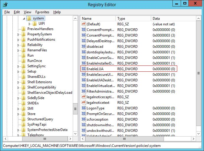 Option 1. You have the option to turn off UAC via registry by changing the DWORD “EnableLUA” from 1 to 0 in “HKEY_LOCAL_MACHINE\SOFTWARE\Microsoft\Windows\CurrentVersion\policies\system”, and doing system reboot.