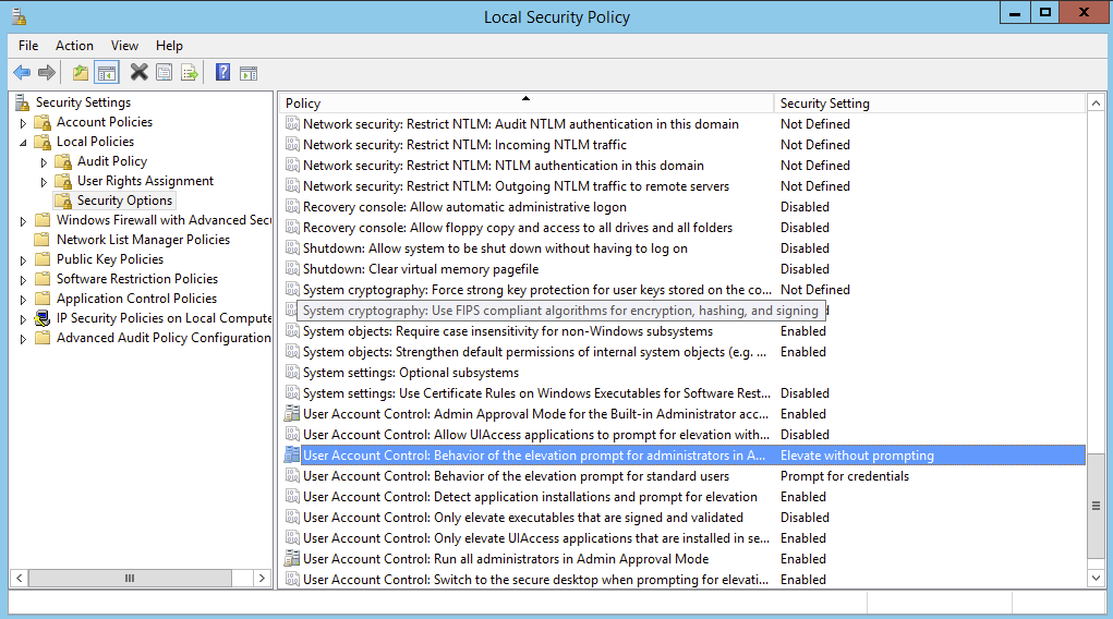 Option 2. Opening **Local Security Policy **(**secpol.msc) **and changing **User Account Control: Behavior of the elevation prompt **to Elevate without Prompting.