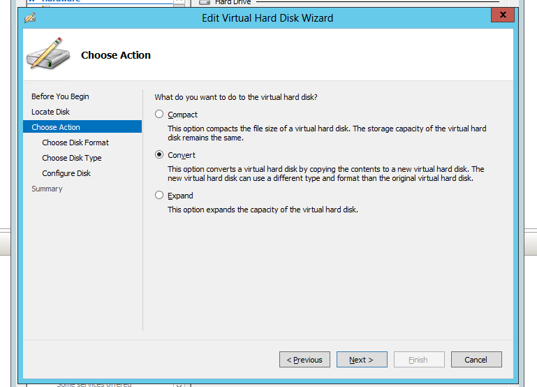 But that also shows no problems. After that next step was to try and move machine to different place. Unfortunately during machine move it also displays **Incorrect function. **Next step was to find which file was actually giving an error. Since this virtual hyper-v machine was made up of 3 files we've tried to convert all 3 from VHD to VHDX type. Unfortunately it worked for 2 out of 3 files.