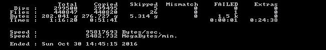 robocopy E: F: /E /ZB /DCOPY:T /COPYALL /R:1 /W:1 /V /TEE /LOG:Robocopy.log