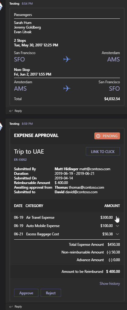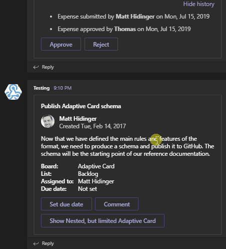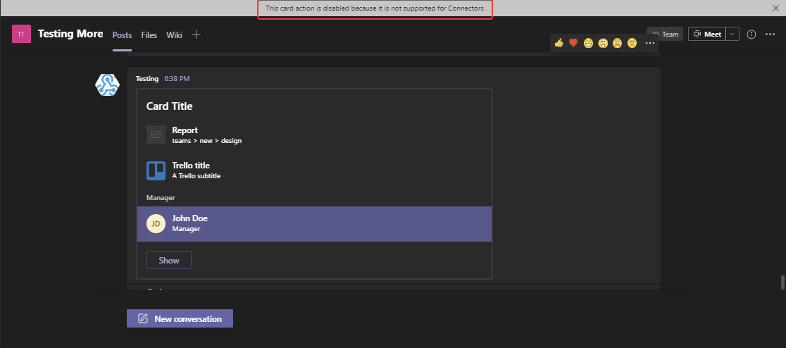 As you can see above, multiple different types of items are used, and while they do display correctly in Microsoft Teams, actions under them are not really providing much value. They either display messages, as seen below, or they do not do any action.