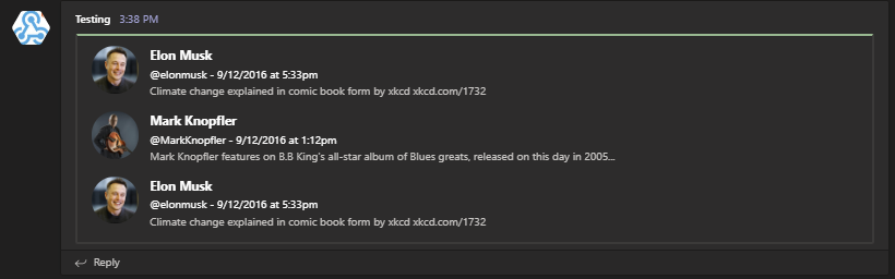 } -Uri $Env:TEAMSPESTERID -Color DarkSeaGreen -MessageSummary 'Tweet'