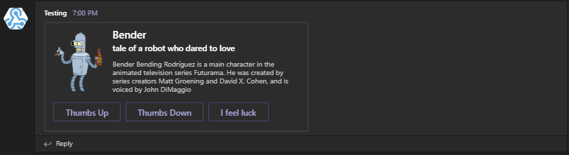 New-ThumbnailCard -Title 'Bender' -SubTitle "tale of a robot who dared to love" -Text "Bender Bending Rodríguez is a main character in the animated television series Futurama. He was created by series creators Matt Groening and David X. Cohen, and is voiced by John DiMaggio" {