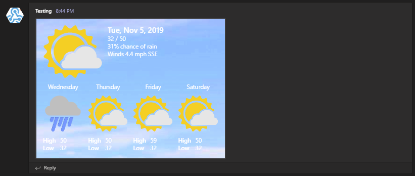 New-AdaptiveCard -Uri $IncomingWebhook -BackgroundUrl 'https://messagecardplayground.azurewebsites.net/assets/Mostly Cloudy-Background.jpg' {