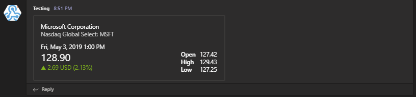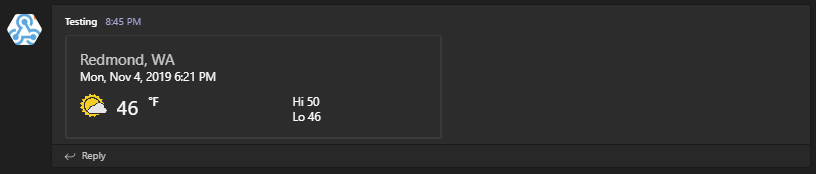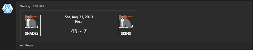 Long code, but what you get is Adaptive Card at it's finest! Of course, as mentioned before, some stuff is not supported. So while you can display all sorts of information that can show or hide on a button press, you need to be aware of its limits. You won't be able to take action. You can press a button that will open the URL, you can press a section that will open the URL, but having it do some magic when you have a bot framework in place is not possible.