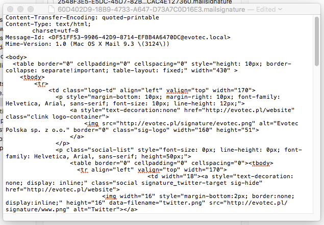 First 5 lines are meta data that needs to stay there as it is. We have to replace the code below with our HTML signature so that it becomes available inside Mail application.