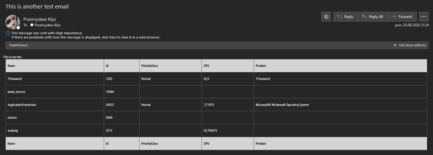 Keep in mind, for now, the implementation of the only works for Application Permissions. I've not yet added support for Delegated Permissions as I didn't have time. Maybe it will work without any changes, but perhaps not. Don't know. As with oAuth, I've not spent time preparing step by step instructions on how to request Graph API credentials, but I'll do so when time allows me to. For now, Google is your man. What I've noticed is that I couldn't send larger HTML/JS/CSS content. Maybe it's due to the size limits of JSON, or I'm not escaping characters properly. The example below shows an HTML body built with PSWriteHTML using an Online switch, meaning it doesn't inline minimized JavaScript content, which may be the sole reason for it failing.