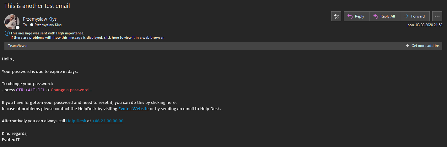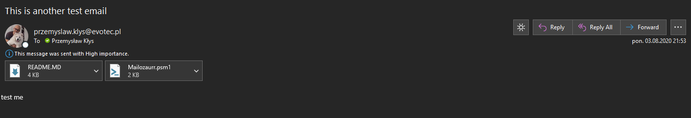 Send-EmailMessage -From @{ Name = 'Przemysław Kłys'; Email = 'test@evotec.pl' } -To 'test@evotec.pl' `