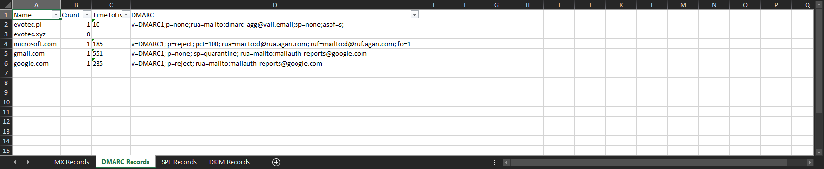 $DMARCRecords | ConvertTo-Excel -FilePath $ExcelReport -WorksheetName 'DMARC Records' -AutoFilter -AutoFit