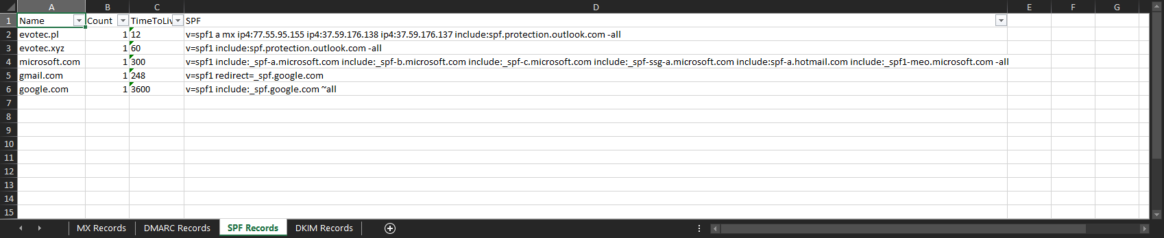 $SPFRecords | ConvertTo-Excel -FilePath $ExcelReport -WorksheetName 'SPF Records' -AutoFilter -AutoFit