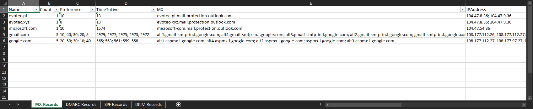 $MXRecords | ConvertTo-Excel -FilePath $ExcelReport -WorksheetName 'MX Records' -AutoFilter -AutoFit