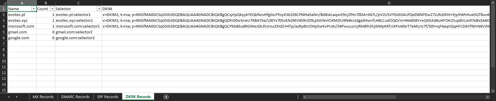 $DKIMRecords | ConvertTo-Excel -FilePath $ExcelReport -WorksheetName 'DKIM Records' -AutoFilter -AutoFit -OpenWorkBook