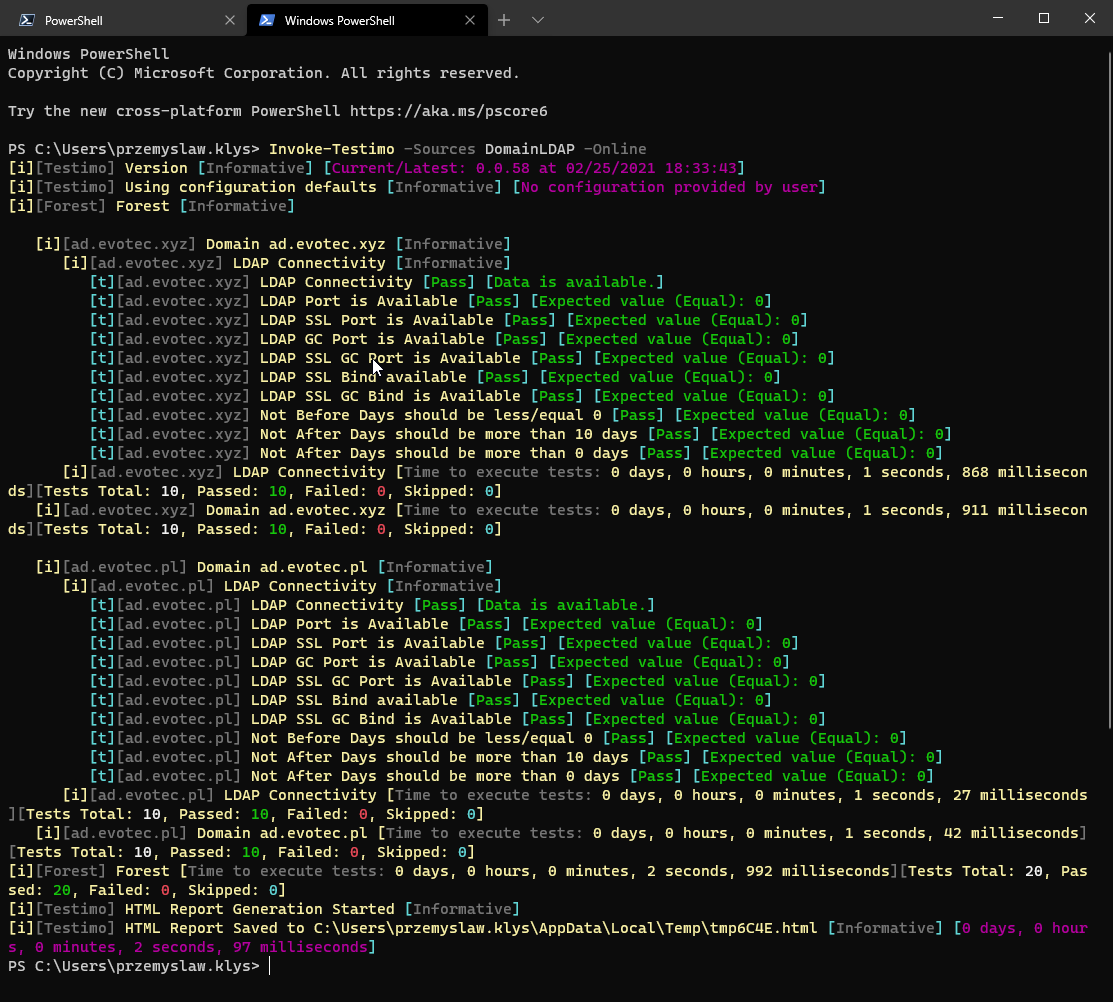 Testimo is a big Active Directory test framework. Testing LDAP is just one of the multiple tests. It contains a lot of reports, and just one of those is shown here. Feel free to explore. The full source code is available (and somewhat readable – one function per file) on GitHub. Not everything may be easy to understand, but I plan to release more blog posts on different ways to deal with issues. What's important to know is that some tests work without any Domain privileges. For example, the DomainLDAP report doesn't require to be Domain Admin. It will work as a standard user as long as that user has domain visibility.