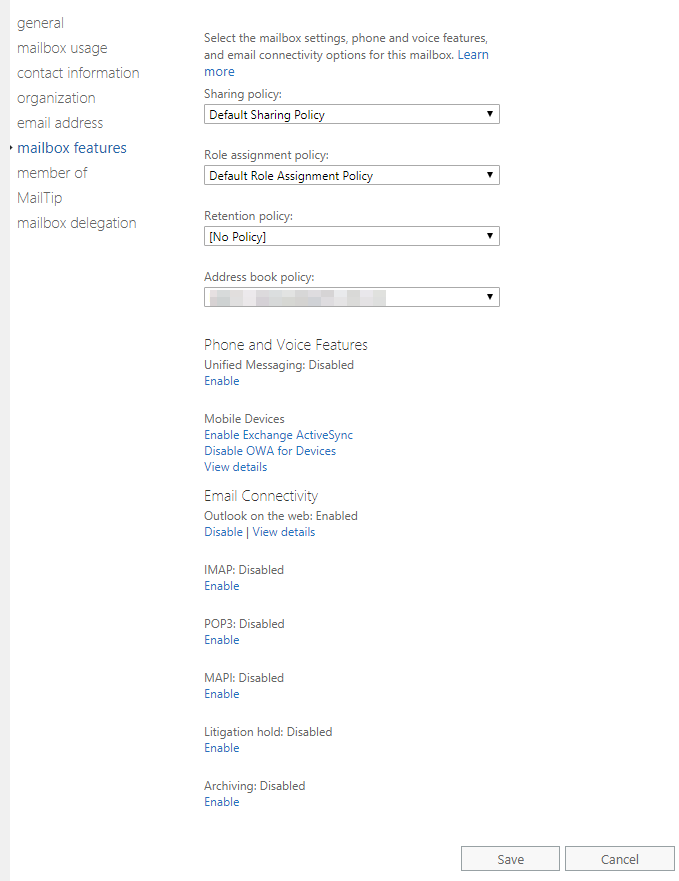Additional verification by manual visit on the autodiscover URL confirmed the problem. While there are multiple scenarios that could be at fault here quick verification of users Mailbox Features shows why there is an error when using Outlook! Can you see it?