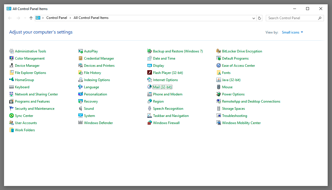 Open Control Panel and make sure to view icons by **Small icons **(otherwise the Mail (32-bit) app may not be visible