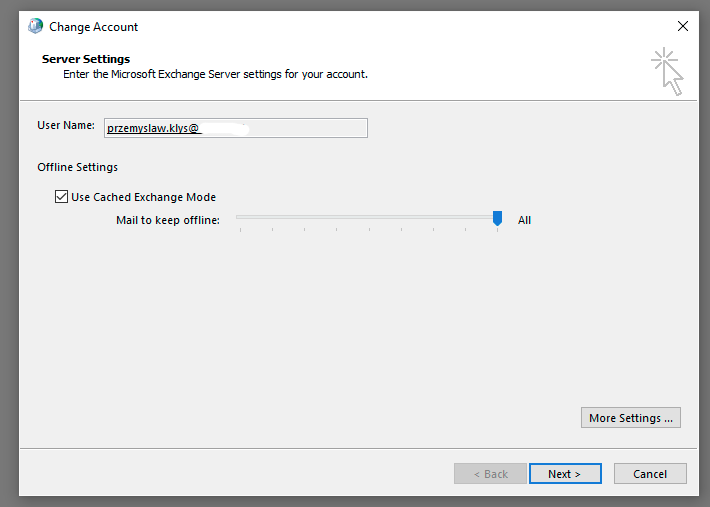 Since Office 365 autodiscover is usually setup correctly at this time Outlook shouldn't have any problems to configure new mailbox for Exchange. If you're using different Exchange server you may need to configure things manually. You can setup multiple Exchange or Office 365 accounts in Outlook this way. There's also one more thing you need to be aware of. By default Outlook chooses only small part of emails to be synchronized locally to Outlook. Since we want to migrate all emails we need to make sure all emails are available in Outlook. To do that we need to double click on our Exchange/Office 365 accounts (or choose Change) to open up additional settings.