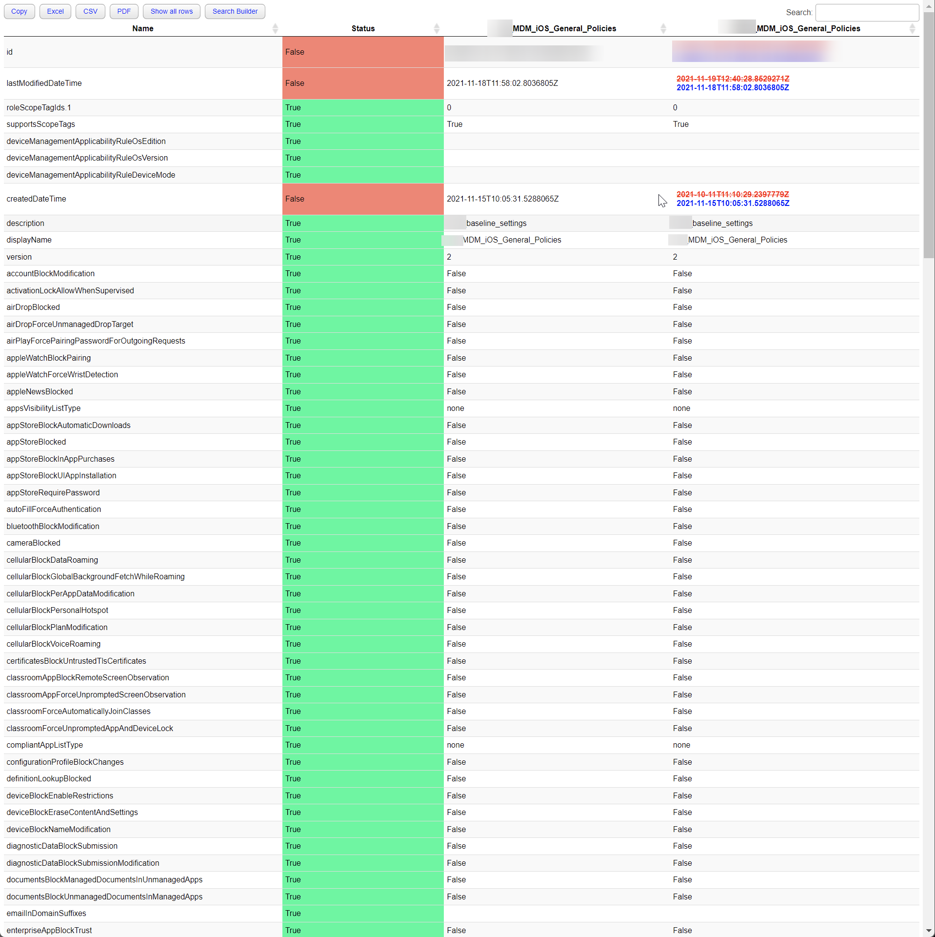 The flattening of an object causes the properties to have a bit different naming. Every nested object property is joined with its parent name property using a dot. This influences the length of properties and changes a bit original object but allows for comparison to be appropriately displayed in a single dimension (table). Of course, if it's comparing nested arrays, it's the order that matters. This should make it pretty easy to compare two or more objects, even when those are complicated. For example, comparing two Intune policies (before and after)