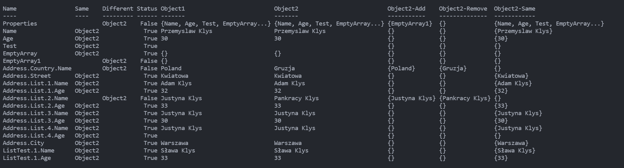 As you can see FlattenObject switch converted all nested objects into a single dimension. It converted nested hashtables arrays into properties on the top level. I've also added a new parameter called ObjectsName, which allows overriding the name of columns. It no longer needs to work with column names such as Source, 1, 2, 3, and instead, use your names. Notice I'm also using a Summary switch which allows for quick comparison where values are the same and where those are different.