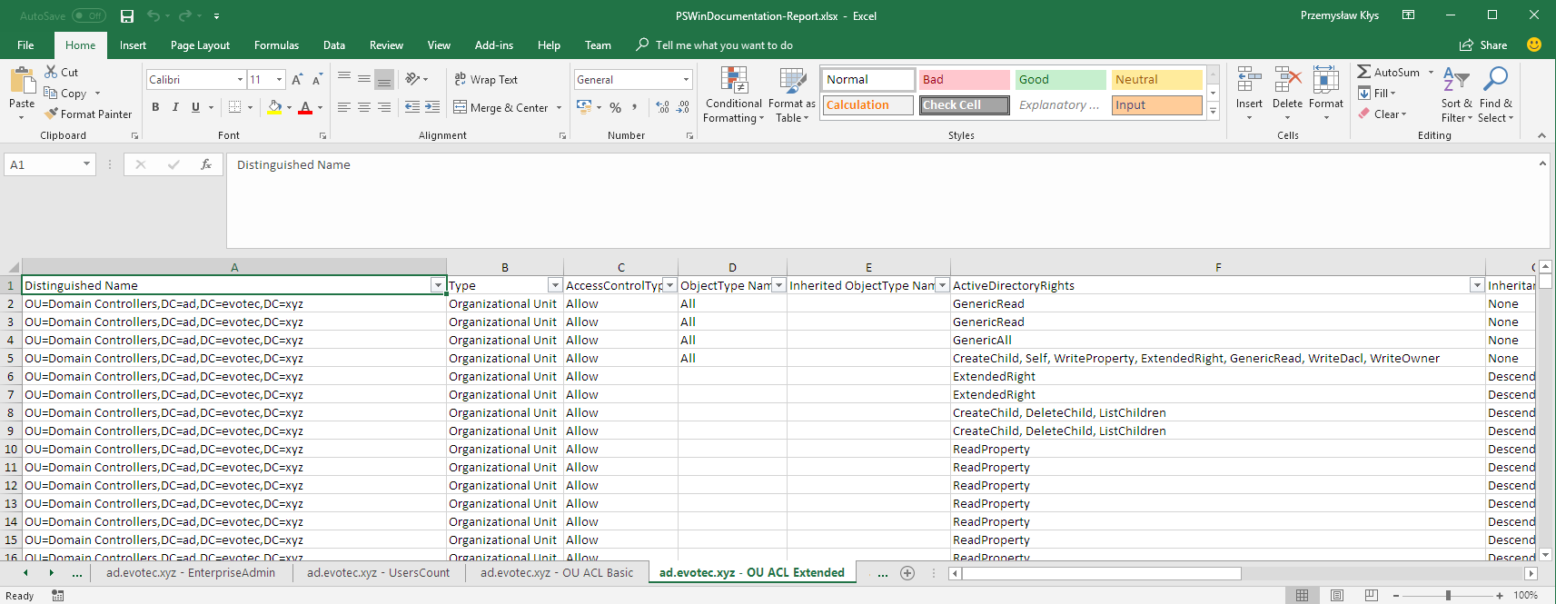 While exporting to Microsoft Word is nice and all some data just can't be put into Word. It won't fit. New version covers so much information from Active Directory that it's impossible to fit that into A4 page. I also wanted **PSWinDocumentation **to become something more.. a tool that can be used to export your AD data for you to verify. Think about it? Export users, check their expiry dates, check last logon times, check last password change, check Domain Admins, check… well how about ACL's for Group Policies? Or maybe** Organizational Units ACL**? It's all there. It wouldn't fit Word, it fits excel perfectly thou. And since the tool is there to use… run it once, export data, analyze it, fix things, export again and verify results.