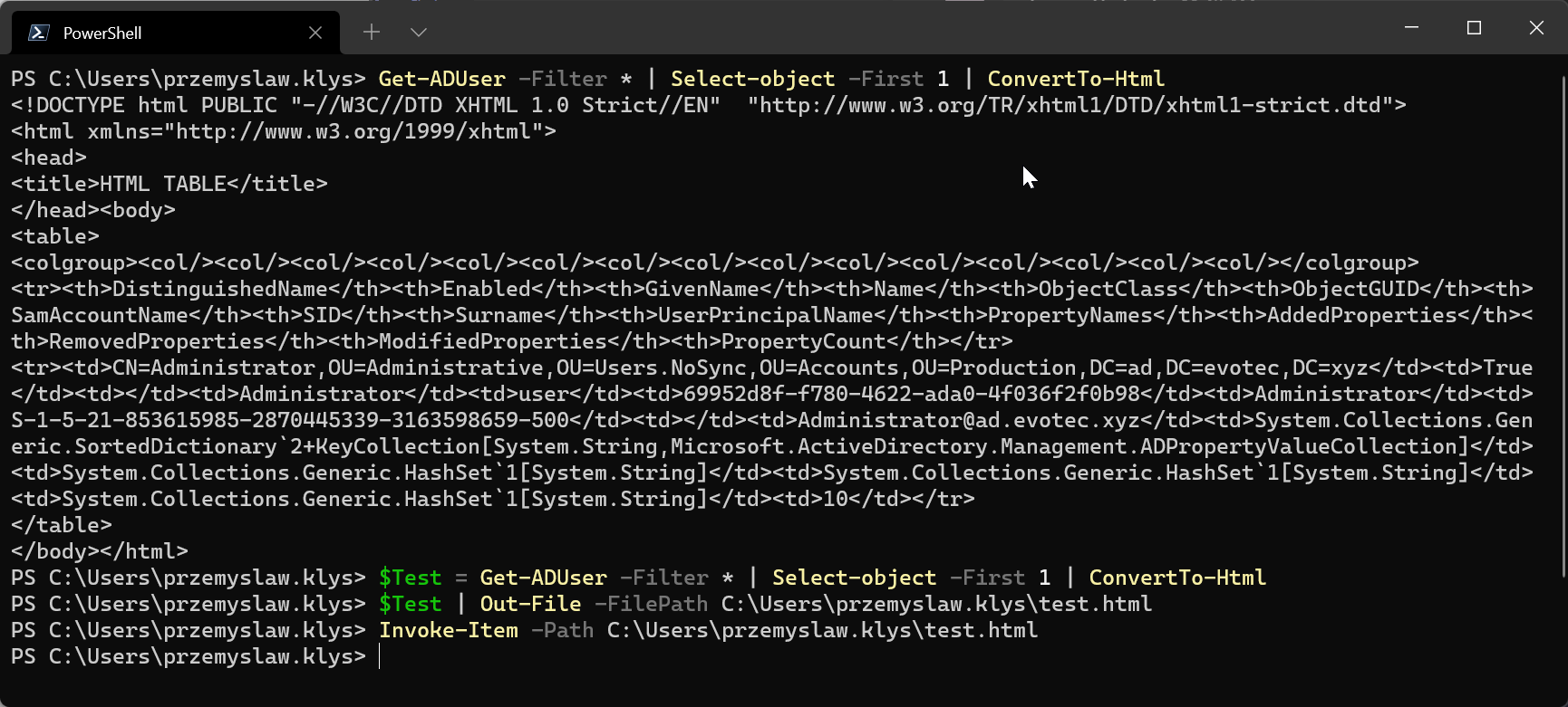 Get-ADUser -Filter * | Select-object -First 1 | ConvertTo-Html