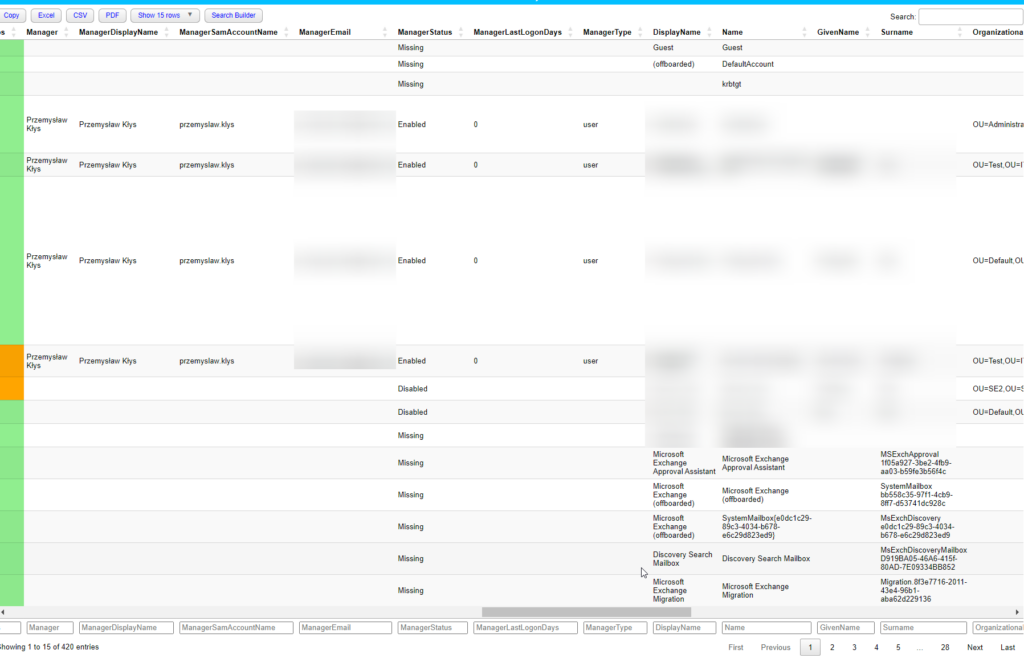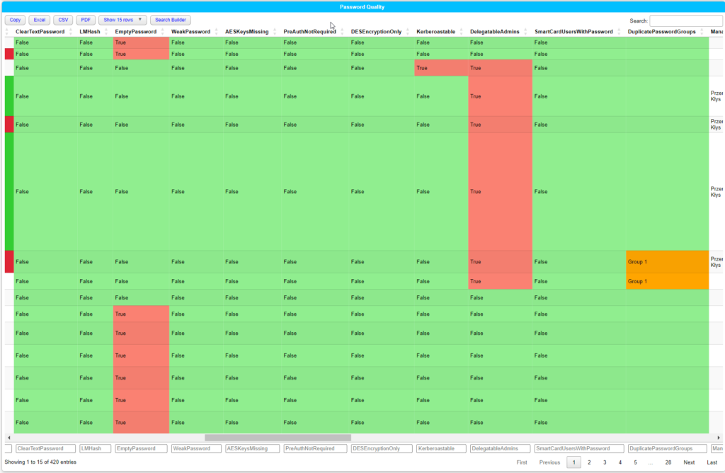 • A list of all users in Active Directory and preliminary information about the account such as whether the user is enabled, last login date, last password date change, password never expires, all the detections around weak passwords, duplicate password groups, AES Keys missing, DES Encryption, LMHash usage, Kerberoastable detection, who's the manager of the user, and whether that manager is active or not. The table is fully exportable to Excel and CSV and can sort and filter.