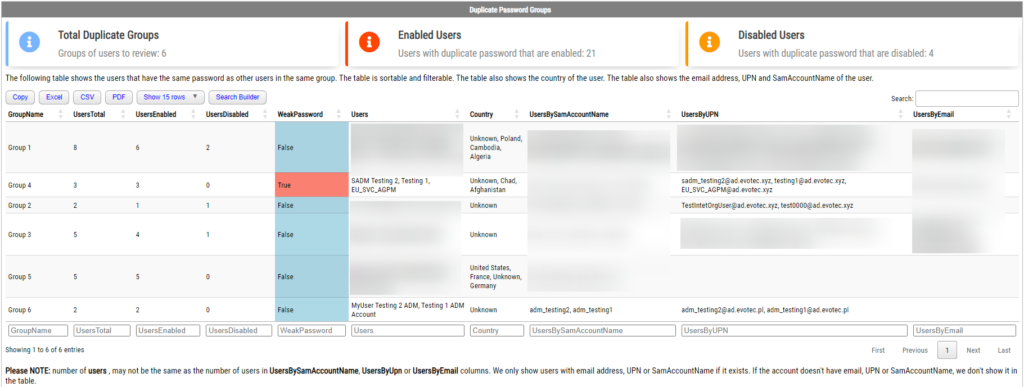 Please NOTE that Duplicate Password Groups are essentially two or more accounts with the same passwords. Weak passwords are in their clear text form that is usually handed over to your users by your Service Desk or any other process you have in your company. Those can also be passwords used over the years as solid passwords that users adopted for their needs thinking they will be safe.