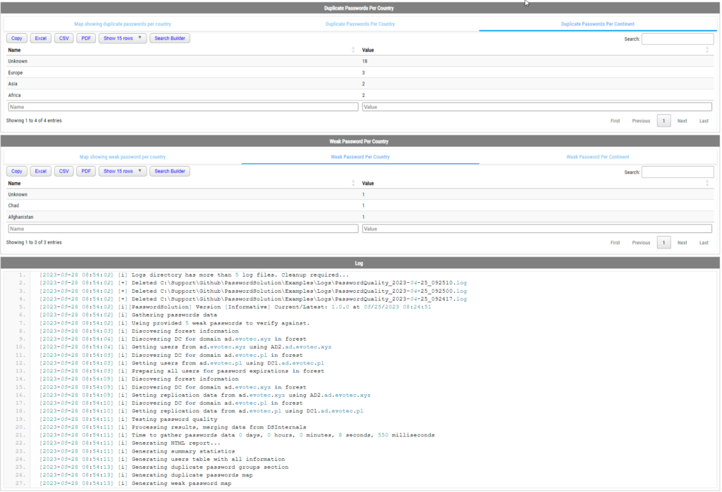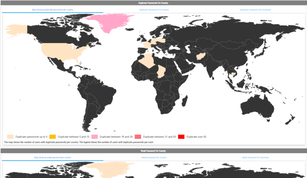 • The fourth section provides country/continent maps/tables for increased analysis of Duplicate Password Groups or Weak Passwords.