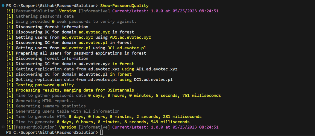 Once you have the required modules installed, using PasswordSolution is super easy. It's just one command with multiple parameters that enable or disable functionality. While you could type Show-PasswordQuality in the console and just let it run, adding additional parameters to control this process is advised.
