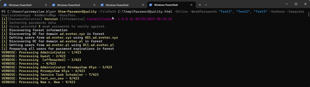 Additional parameters allow you to specify weak passwords, whether to enable separate duplicate groups or add a world map (if you happen to have an organization spread over multiple countries). You can also use Verbose and PassThru parameters to see more of what is happening while the scan is in progress and get raw data you can automate.