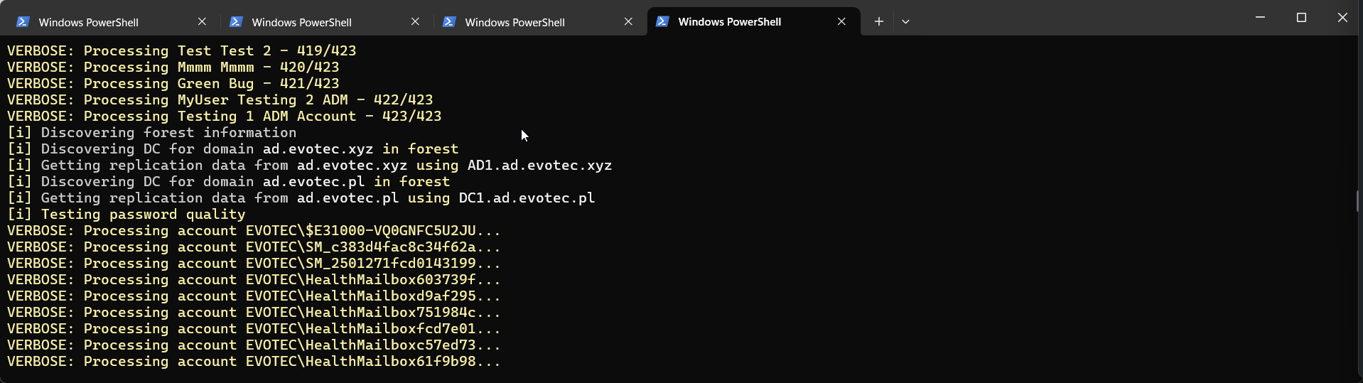 • Keep in mind that while, at this stage, hashes of the accounts are available in the module, we are not doing anything to them and use Test-PasswordQuality data output instead.