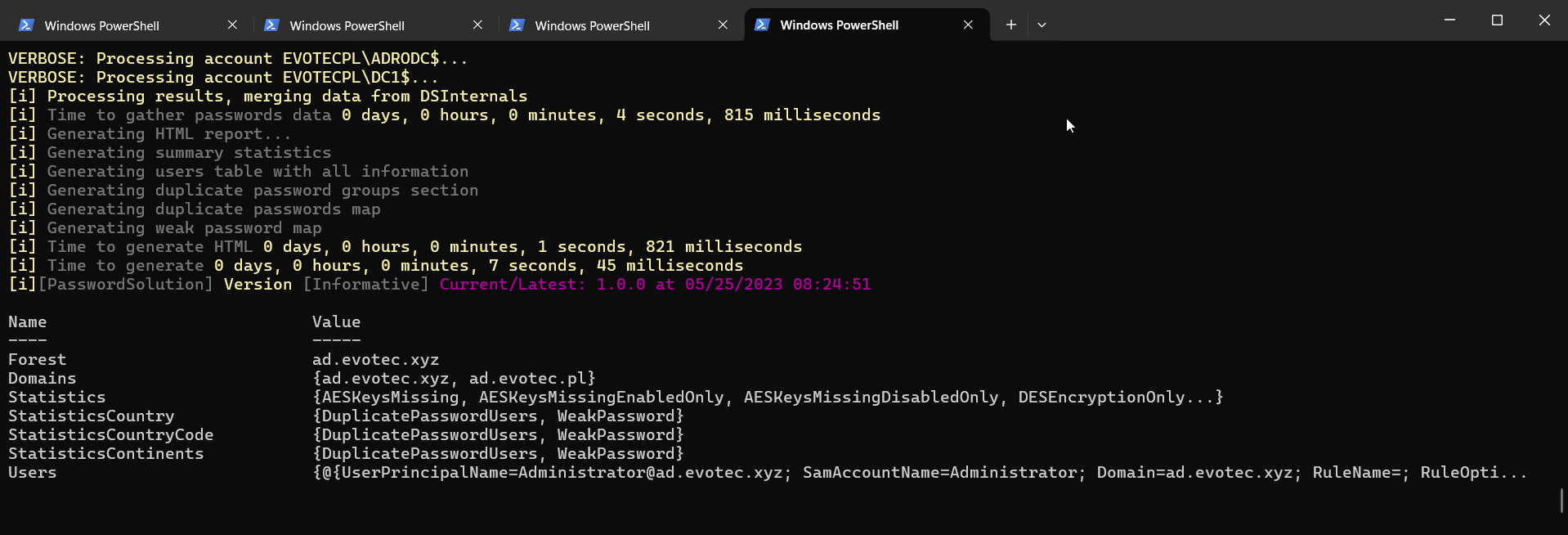 Active Directory plays a central role for many organizations: those with twenty users and those with thousands of them. While everyone is looking at Azure AD as a replacement, it will not happen for most organizations for a very long time, and most organizations will stay in a hybrid environment. Over recent years there was a push to split the roles in Active Directory so that Administrators don't use their standard account to manage Active Directory but have their particular account for different Tier to enhance security. Users were also pushed to make sure they use more complicated passwords, changed less often. Suppose your organization is lucky enough to implement this correctly and has users and administrators who care. In that case, you now have Active Directory with unique, complex passwords or an even better password-less environment. If you're less lucky, your Admins use the same passwords for all their AD accounts, whether this is to open an email or update Active Directory Schema. On the other hand, your users don't care at all and often use the same password you gave them the first day, and once it expires, they ask for another reset and continue using what is provided to them. PasswordSolution module can help you find those people and try to reason with them to enhance your company's security posture.Today I would like to offer you an easy way to verify whether your environment password posture is good enough or requires some work. I wrote a PowerShell module called PasswordSolution, which has two main features: